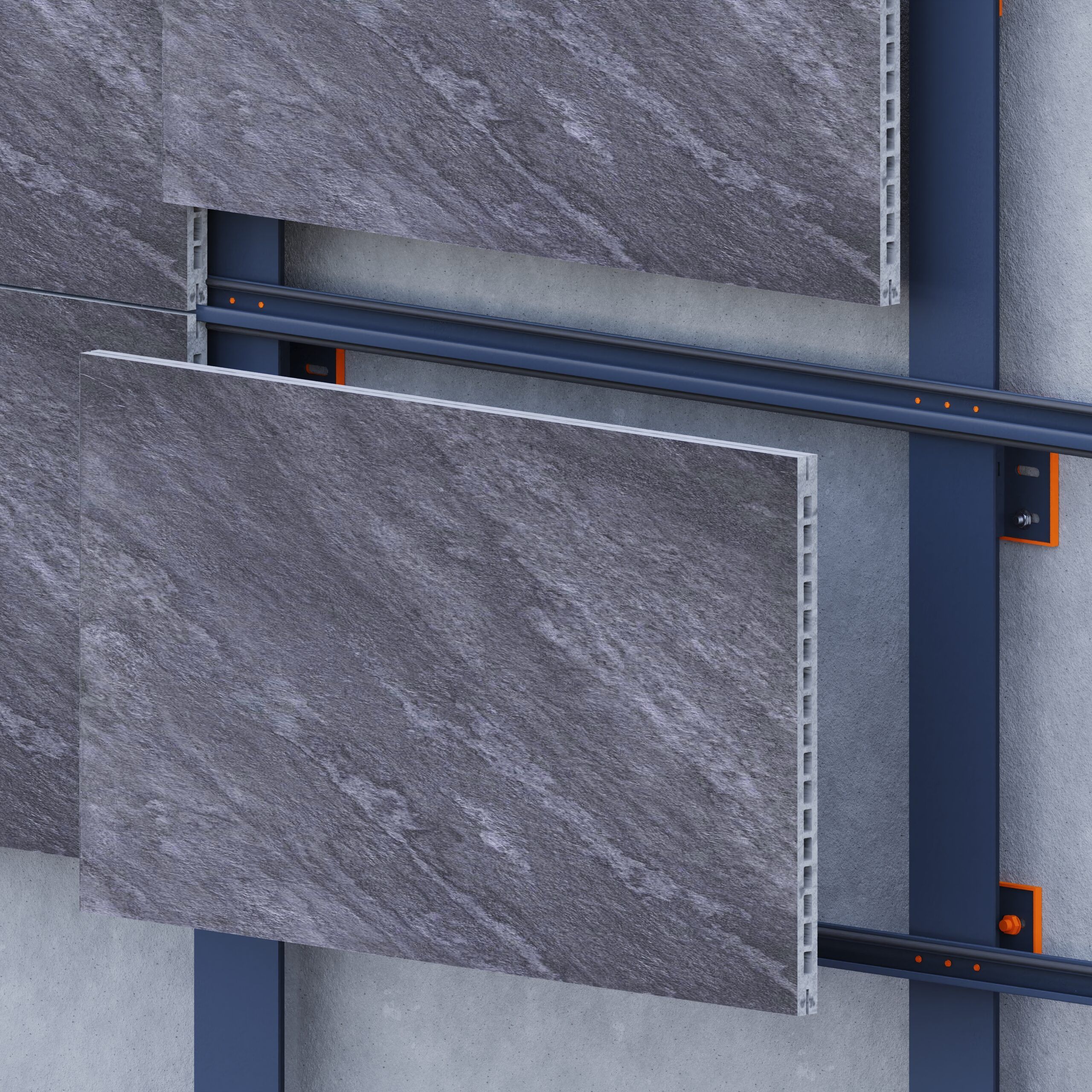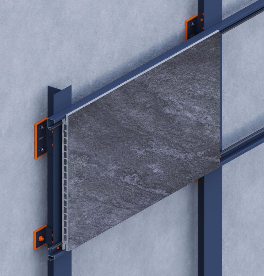 This concealed mechanical system is designed for 20 mm extruded porcelain tiles with factory-formed edge grooves. Tiles are secured via continuous horizontal aluminum profiles and a rear EPDM strip, which cushions against vibrations and allows for system flexibility.Ideal for horizontal tile installations, the system delivers a clean, fastener-free finish with precise alignment. As a dry mechanical method, it eliminates the need for adhesives, reducing environmental impact. Engineered for wind resistance, thermal expansion, and structural stress, it ensures long-term performance and joint stability.