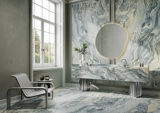 Iconic Cipollino reinterprets Cipollino marble with a vibrant texture, characterized by wavy veining. Green hues alternate with hints of white and gray, creating visual dynamics of great natural charm. Iconic Cipollino transforms any space into a space of authentic character, where tradition becomes an element of contemporary design.