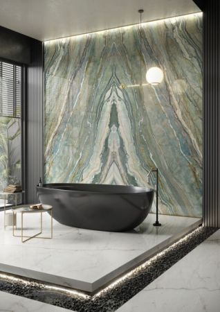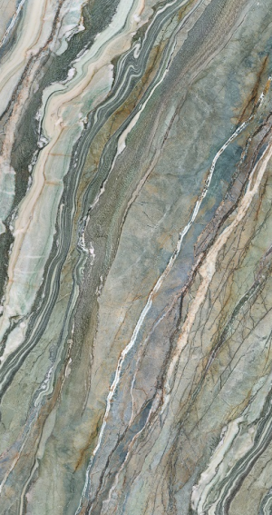 Royal Peacock is a porcelain slab of remarkable vibrancy, inspired by the elegance of exotic marble. Its rich blend of emerald greens, earthy browns, and subtle ivory tones flows in dynamic, fluid veining, reminiscent of a peacock’s plumage. Bold and luxurious, it transforms interiors into dramatic statements of artistry and sophistication.