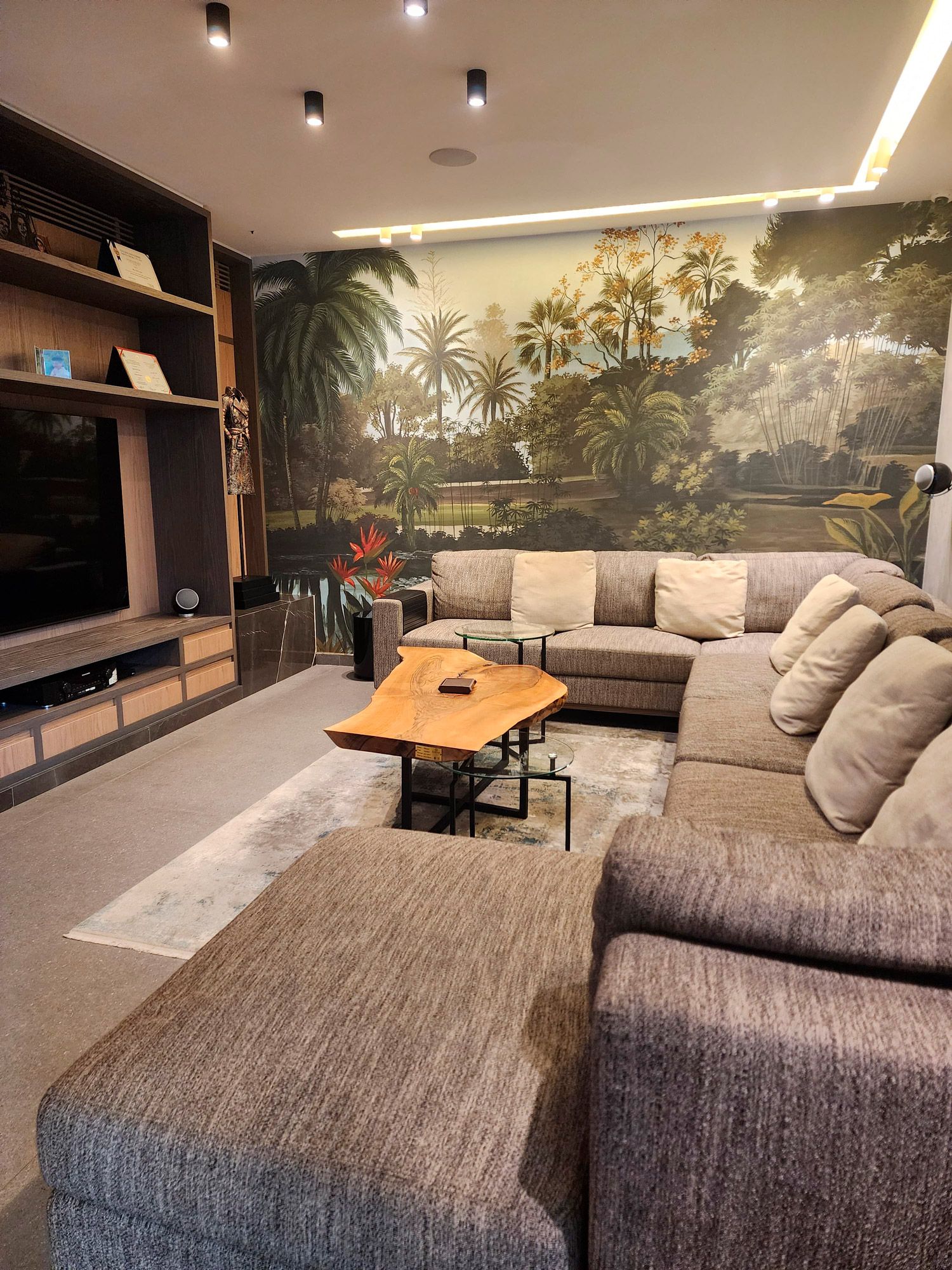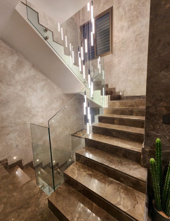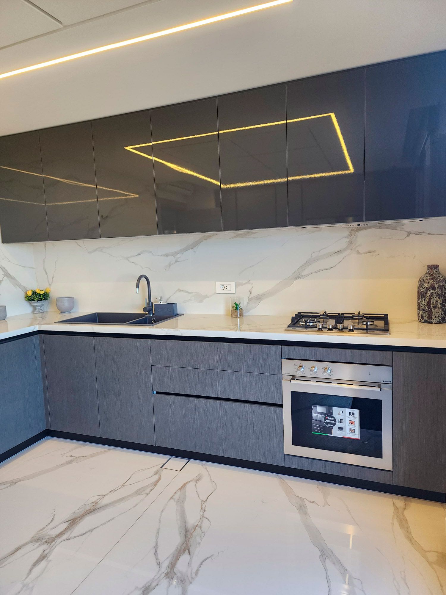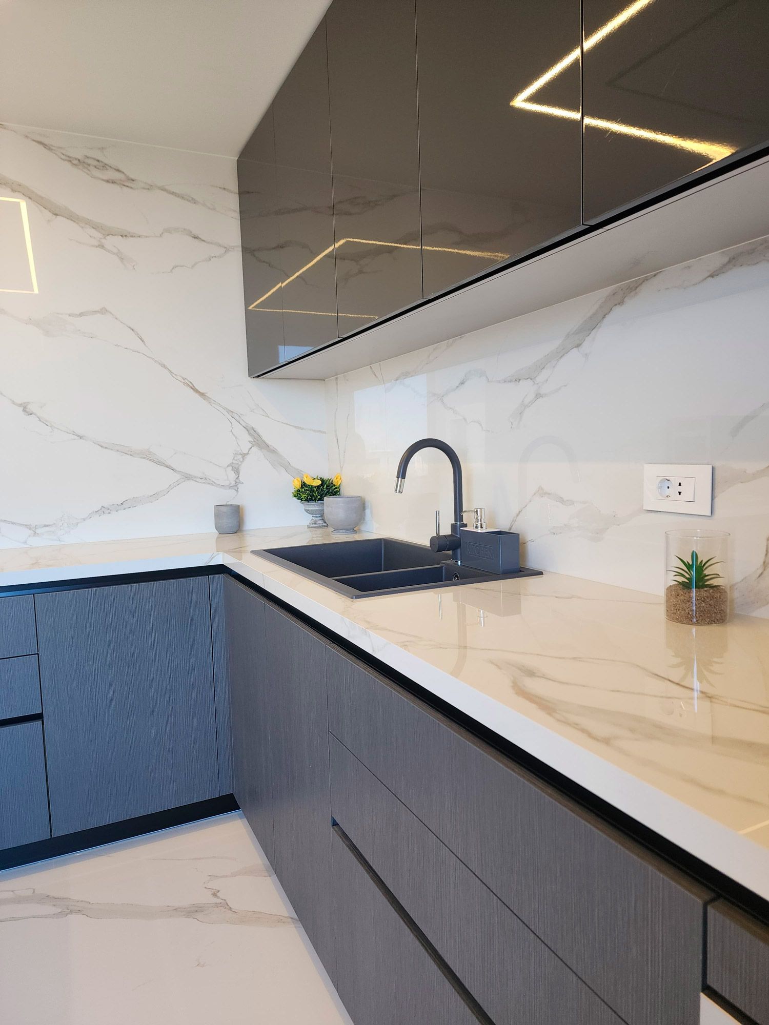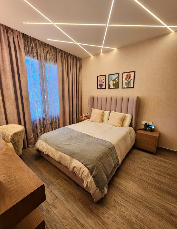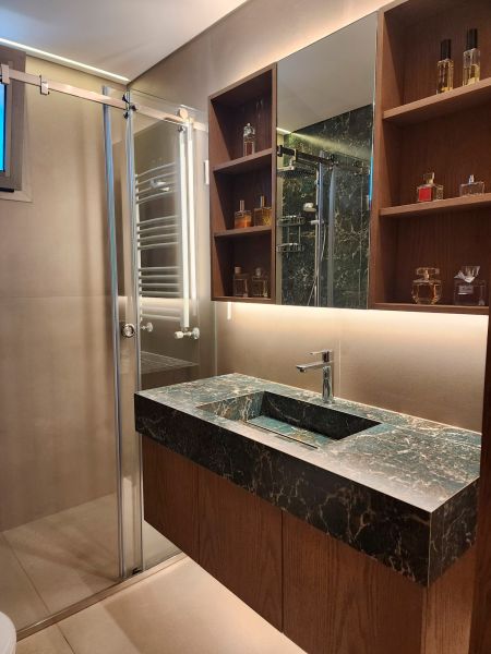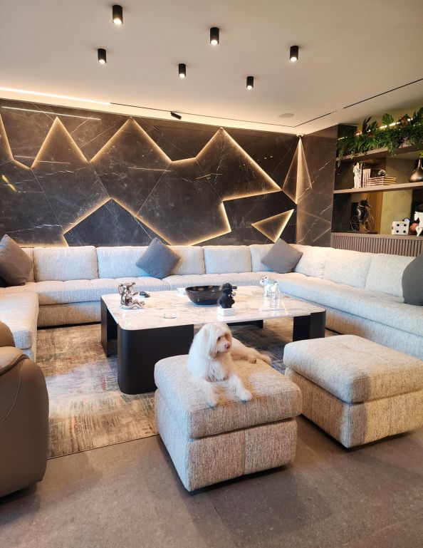 The bathrooms of the CO Project are defined by contrast and expression. One features Amazonite porcelain, a material that channels the mineral richness of natural Amazonite stone with cool green-blue hues and intricate patterns. This slab becomes the focal point, complemented by warm wood cabinetry and soft lighting to create a space that feels both fresh and refined.In the other bathroom, the narrative turns bolder with the use of Patagonia porcelain slabs. A dynamic interplay of crystalline textures, earth tones, and ivory whites, Patagonia offers an almost artistic quality — transforming the vanity and walls into a sculptural installation. Every surface feels purposeful, echoing nature’s unpredictability in a perfectly controlled setting. From moody stone to luminous marble-like finishes, the CO Project showcases a clear mastery of material composition. Each room embraces a unique identity, yet all are unified by a commitment to refinement, balance, and timeless design.